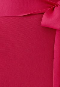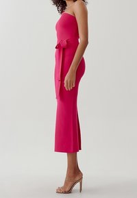 Robe ajustée à une épaule en rose vif, fabriquée en tissu lisse. Elle présente une ceinture à la taille et une longueur midi, avec un matériel minimal.