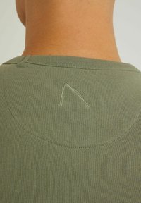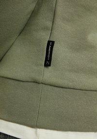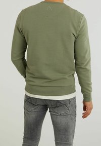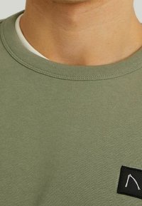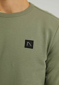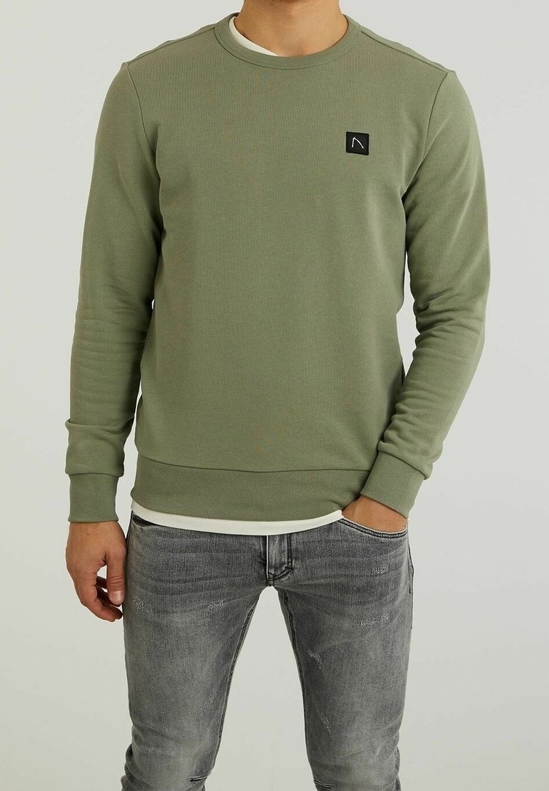 Homme portant un sweat-shirt à manches longues vert olive avec un patch logo noir, un sous-vêtement blanc et un jean gris délavé, debout devant un fond uni.