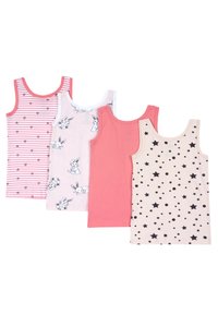 Quatre débardeurs : rose avec des cœurs, blanc avec des imprimés de lapins, rose uni et beige avec des étoiles noires. Tous sont en tissu doux et ont des accents en forme de nœud.