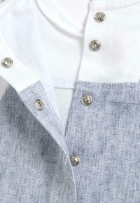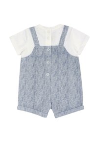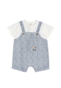 Salopette en denim bleu avec un t-shirt blanc à manches courtes. Comprend des boutons en bois, une poche avant, et un motif de cheval brodé.