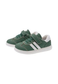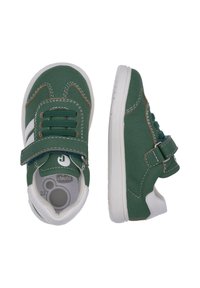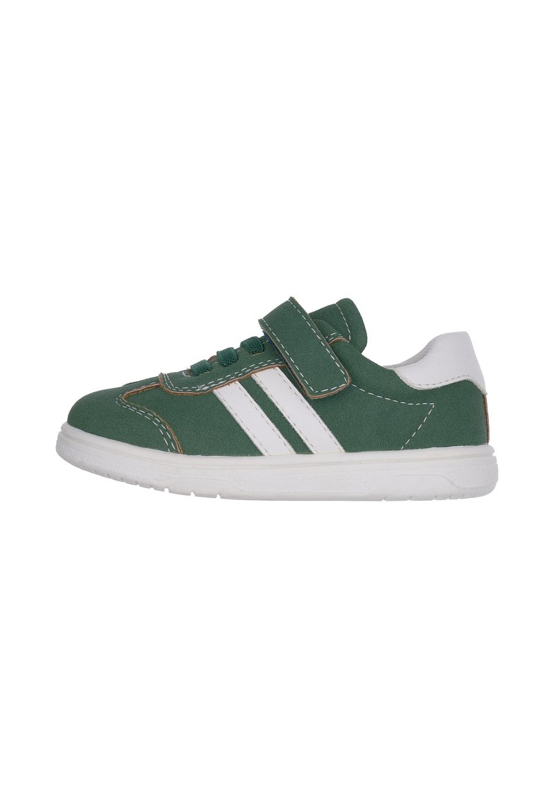 Baskets en daim vert avec des accents en cuir blanc, deux bandes blanches, une sangle à boucle auto-agrippante et une semelle en caoutchouc texturée.