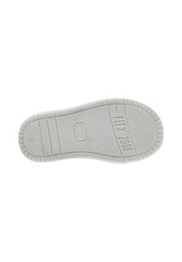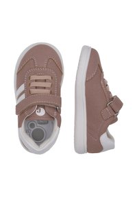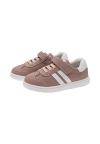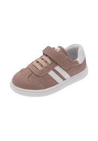 Chaussure en daim rose avec des accents blancs, dotée d'une bride en Velcro, d'un bout rond et d'une semelle texturée. Design simple avec des détails cousus.