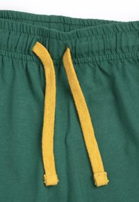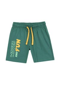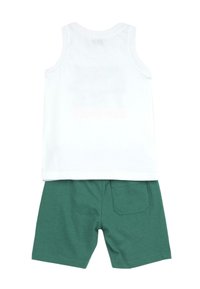 Haut blanc sans manches avec le texte « Ride the Summer » et short vert avec le texte « Waves and Fun », stylisés pour une tenue décontractée d'été.