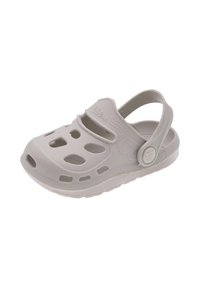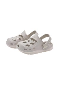 Sabots légers en caoutchouc de couleur gris pâle. Dotés de trous de ventilation, d'une bride arrière et de semelles texturées pour une meilleure adhérence. Design simple et arrondi.