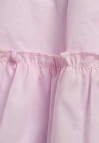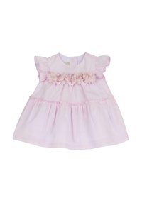 Robe de bébé rose clair avec des manches courtes à volants et des décorations en tissu sous forme de fleurs sur la poitrine, taille froncée et jupe évasée.