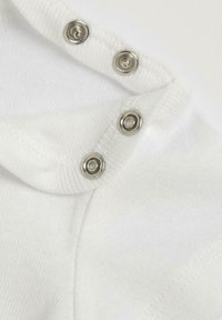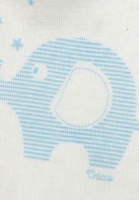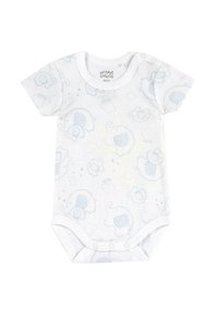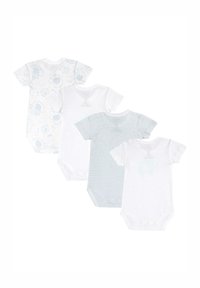 Quatre bodysuits pour bébé à manches courtes en blanc et bleu clair. Les caractéristiques incluent des graphiques d'éléphants, des motifs de nuages et des rayures horizontales.