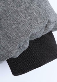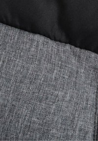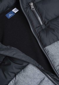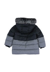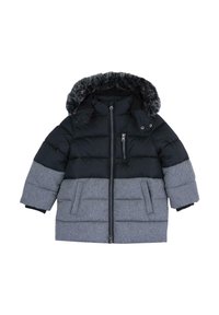 Veste d'hiver bicolore pour enfant avec partie supérieure noire, partie inférieure grise, fermeture éclair avant, poche poitrine zippée et capuche doublée de fourrure.