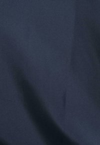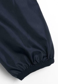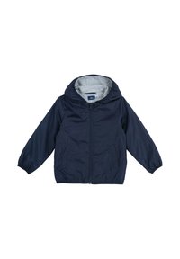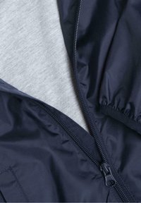 Veste légère bleu marine avec une doublure de capuche grise, une fermeture éclair à l'avant, des poignets élastiques et des poches latérales. Présente un design décontracté.