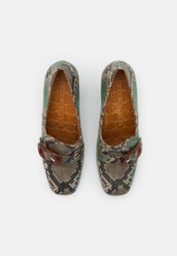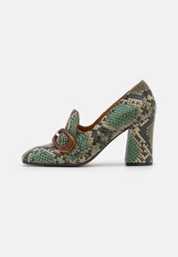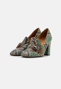 Chaussures à talons hauts à motifs verts et marron avec un design en cuir de serpent texturé, présentant une grande boucle marron en accent sur le dessus.