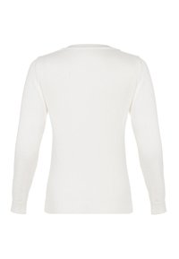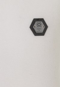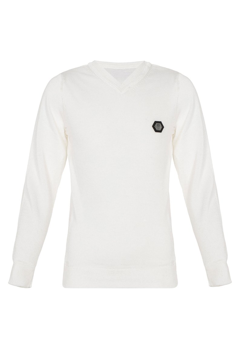 Pull blanc à manches longues avec col en V, poignets et ourlet côtelés, arborant un petit patch logo hexagonal noir sur le côté gauche de la poitrine.