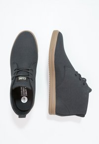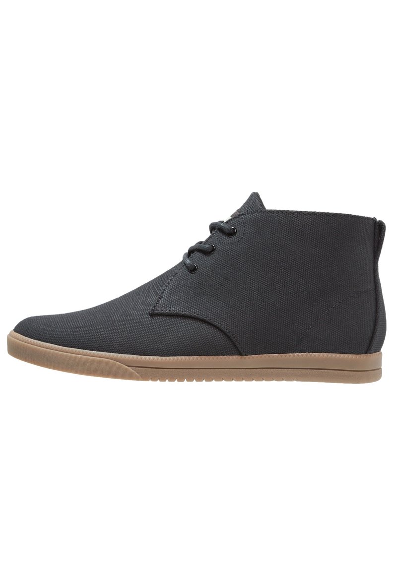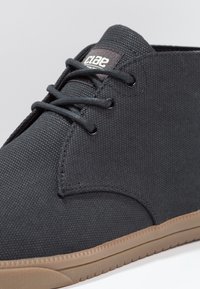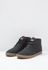 Bottes à cheville en toile noire avec une surface texturée, un bout rond et une semelle en caoutchouc beige. Elles sont équipées d'œillets pour les lacets et présentent un design simple.