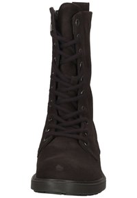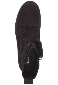 Bottes cheville en daim marron avec un design à lacets, semelle en caoutchouc et une languette à l'arrière. Comprend des œillets métalliques pour les lacets.
