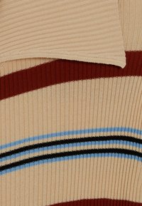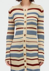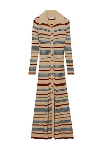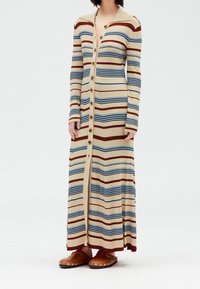 Gilet long rayé en beige, bleu et rouille ; texture côtelée avec une fermeture à boutons et une fente sur le côté. Sabots marron avec des accents cloutés.