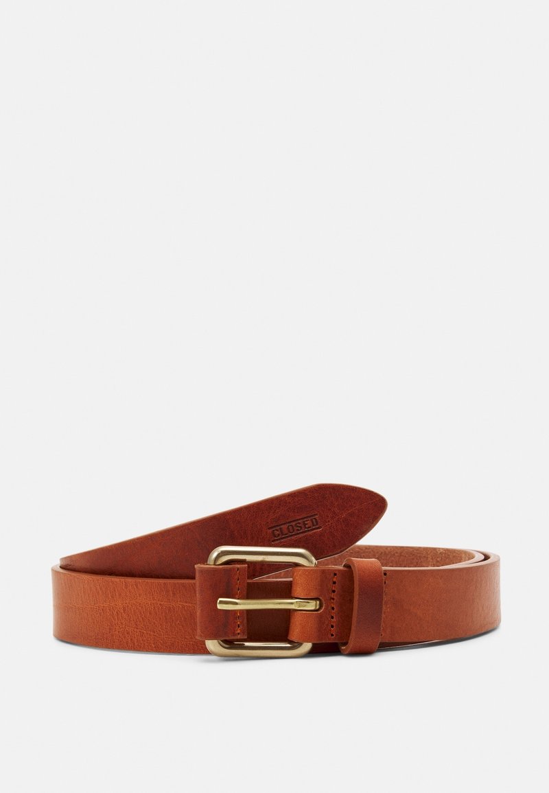 Ceinture en cuir marron avec boucle rectangulaire dorée et inscription "CLOSED" embossée près de l'extrémité effilée, enroulée sur un fond blanc.
