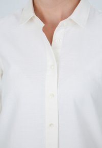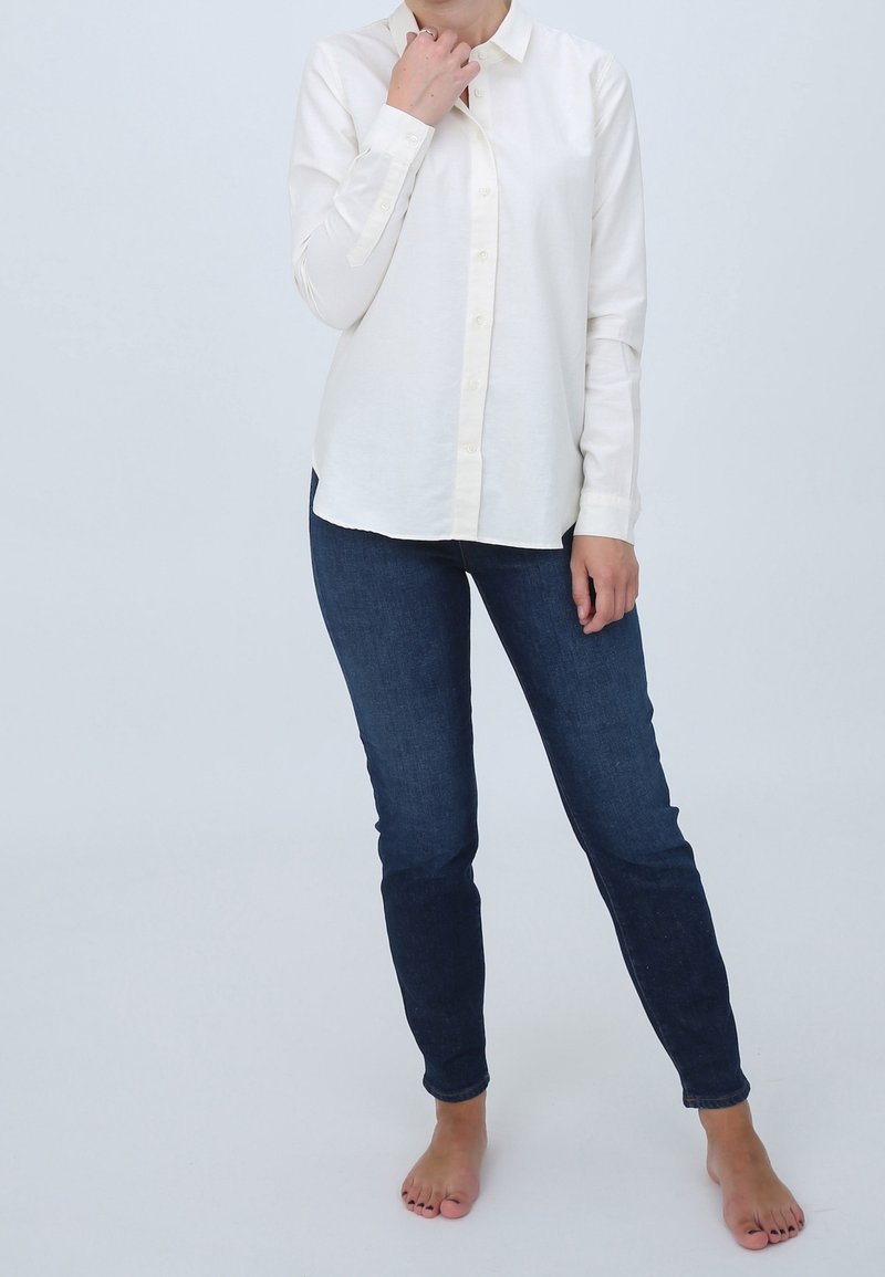 Personne debout pieds nus, portant une chemise blanche à boutons et un jean skinny bleu foncé, sur un fond clair uni.