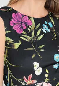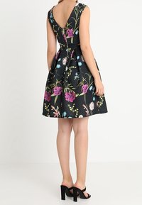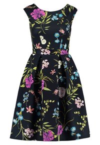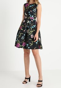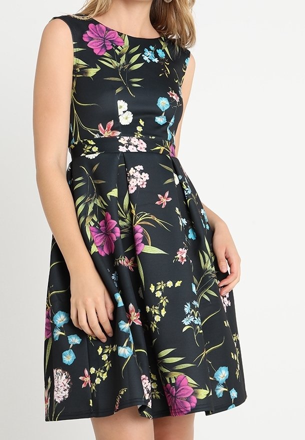 Robe noire sans manches avec imprimé floral coloré, corsage ajusté et jupe évasée portée par une femme aux cheveux lâchés.