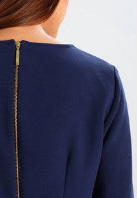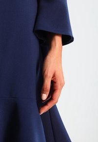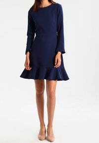 Robe bleu marine en tissu lisse, avec un corsage ajusté, des manches évasées et un ourlet à volants.
