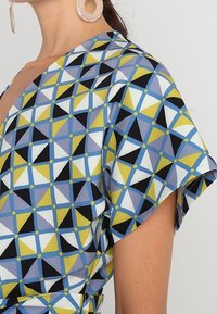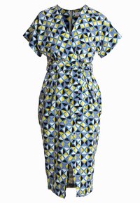 Robe portefeuille à motifs avec des dessins géométriques triangulaires en bleu, jaune et noir. Manches courtes, ceinture à la taille et fente frontale.