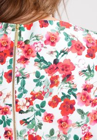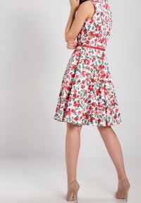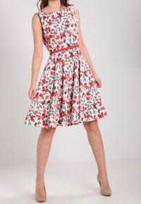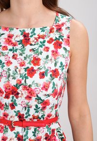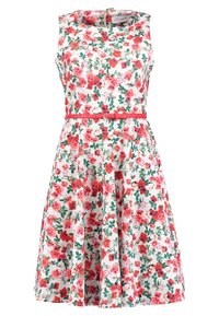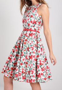 Robe blanche sans manches à motif floral rouge et rose, taille ajustée avec une fine ceinture rouge, et une jupe évasée se terminant au-dessus du genou.