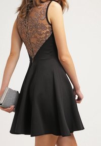 Femme portant une robe noire sans manches avec une jupe évasée et un panneau en dentelle transparente au niveau de l'encolure.