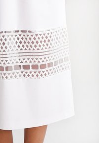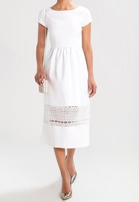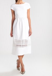 Robe midi blanche avec manches courtes, taille froncée et bord en dentelle. Le tissu a une texture lisse ; les chaussures sont métalliques avec un bout pointu.