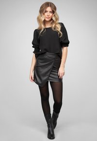 Jeune femme aux cheveux blonds ondulés, portant un chemisier noir à manches bouffantes et une jupe portefeuille en cuir noir, sur un fond uni.