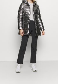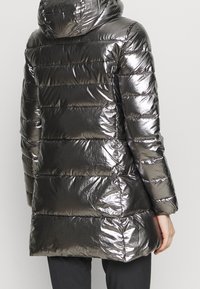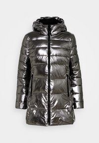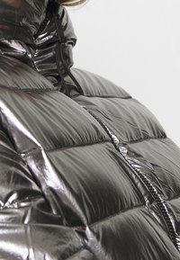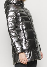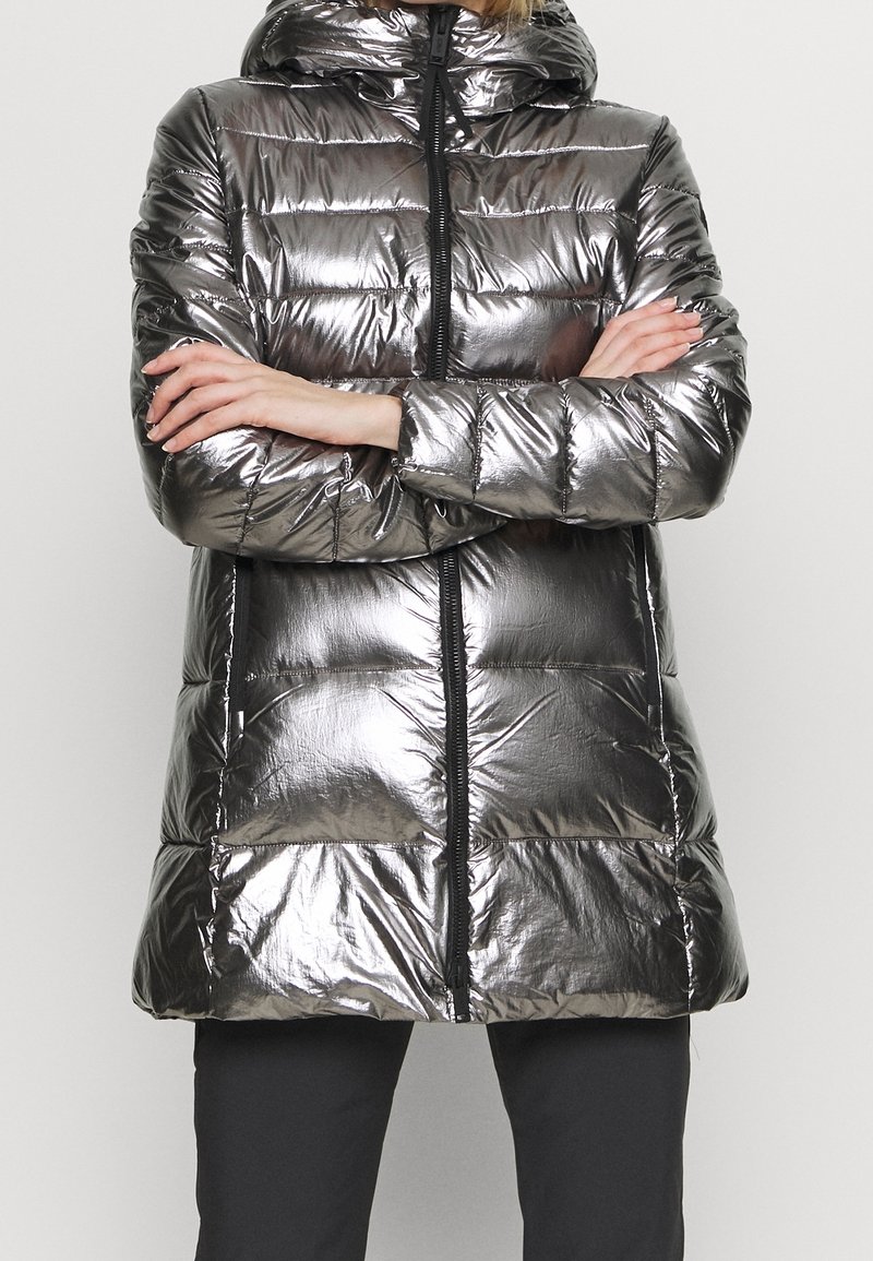 Veste matelassée métallisée avec capuche, dotée d'une fermeture éclair à l'avant, de coutures horizontales et de poignets élastiques. Couleur gris foncé avec finition brillante.