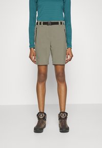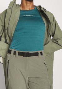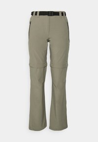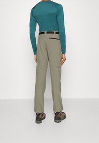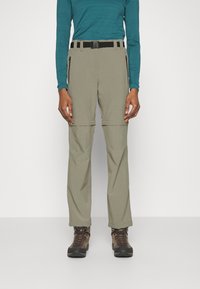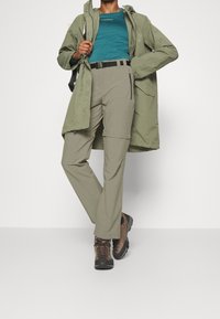 Pantalon kaki à zip amovible avec ceinture, poches zippées latérales et coupe droite. Assorti à des bottes de randonnée marron et un haut à manches longues bleu sarcelle.