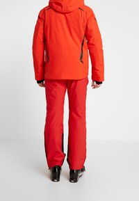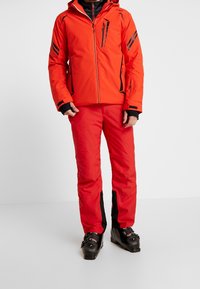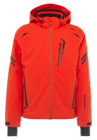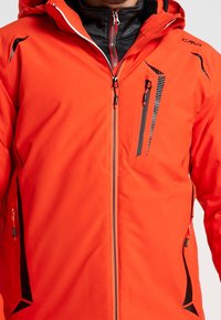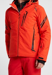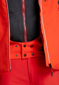 Veste isolante rouge avec des accents noirs, poches zippées et un col haut. Présente une texture lisse et des éléments de design audacieux et angulaires.