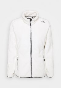 Veste en polaire blanche avec un col montant, fermeture zippée sur le devant et poches latérales. Accentuée par des zips et des poignets noirs. Matériau doux et texturé.