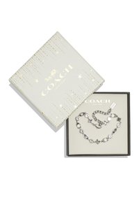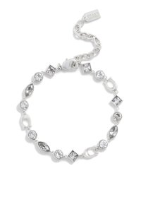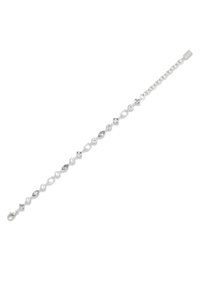 Bracelet en argent avec des cristaux clairs alternant entre ronds, carrés et marquises, et une chaîne réglable avec fermoir portant une étiquette Coach.