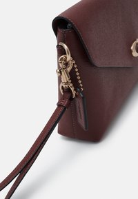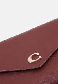 Coin d'une pochette en cuir brun texturé avec fermeture à clip dorée et détail en chaîne sur un fond clair uni.