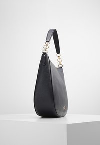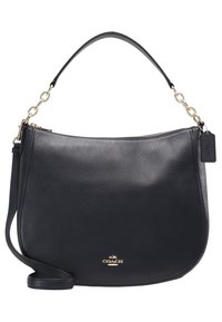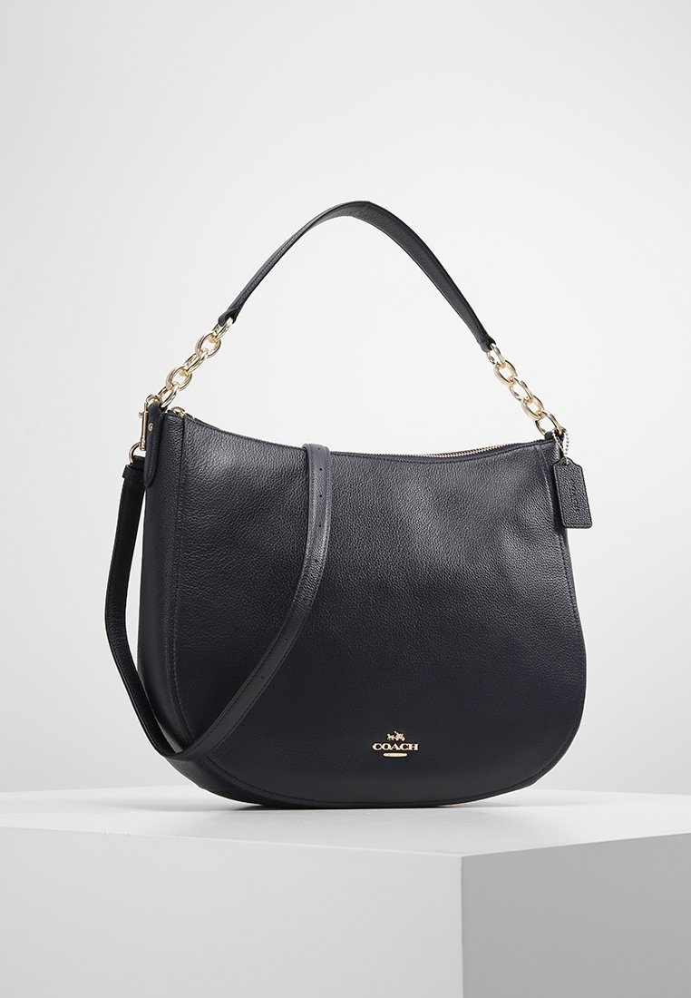 Sac à bandoulière en cuir noir avec accents en chaîne dorée, fermeture éclair et logo Coach sur le devant, présenté sur un socle blanc.