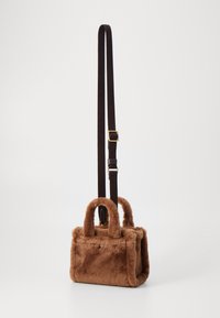 Petit sac à main en peluche marron avec poignées courtes, fermeture à tourner à l'avant, broderie de logo noire, étiquette en cuir et bandoulière sombre amovible.