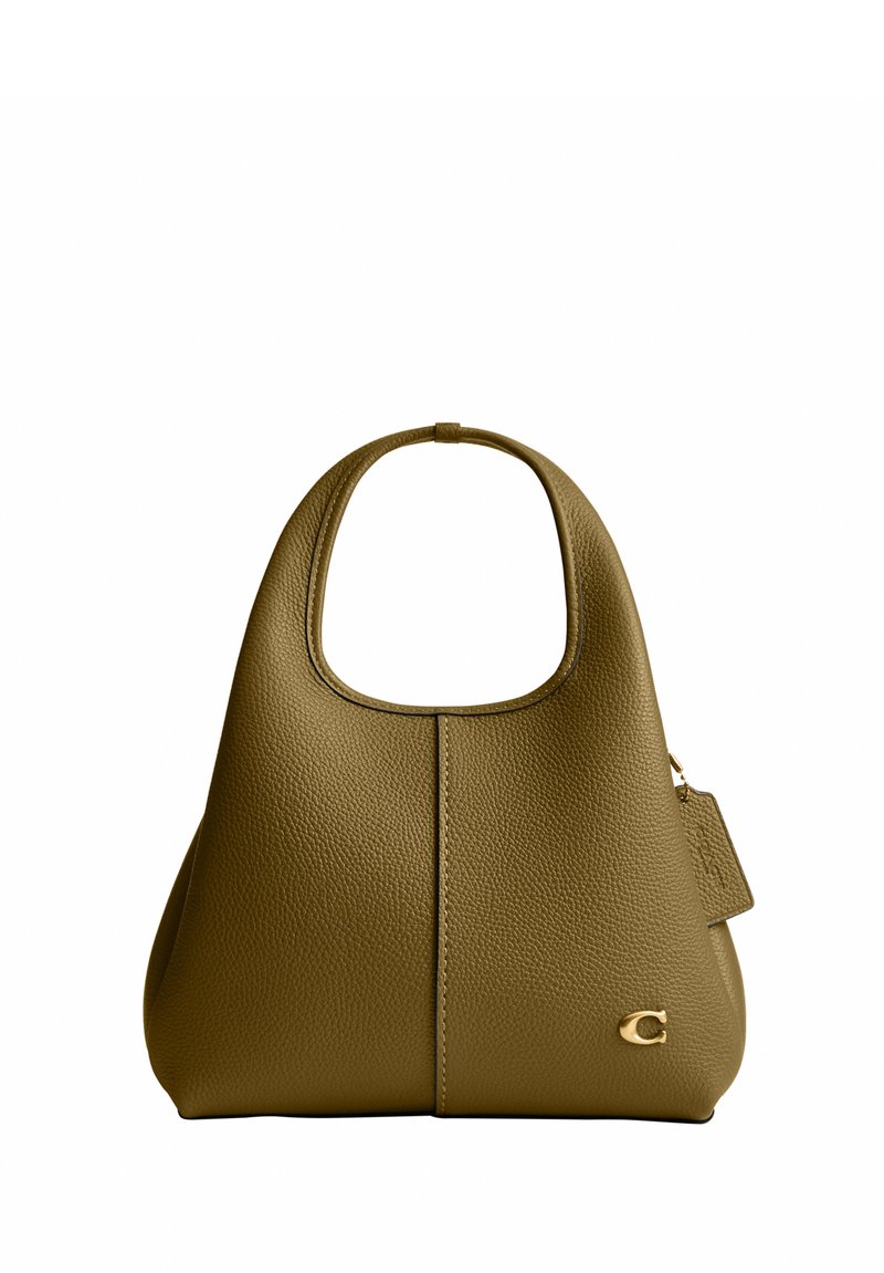 Sac à main en cuir texturé vert olive avec une poignée supérieure incurvée, un logo en métal doré à l'avant et une petite étiquette en cuir attachée.