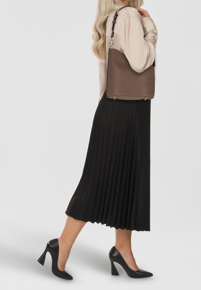Femme portant une jupe midi plissée noire, des talons hauts noirs, un haut beige à manches longues, avec un sac à main en cuir marron porté à l'épaule.