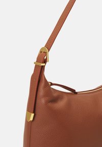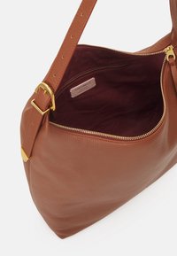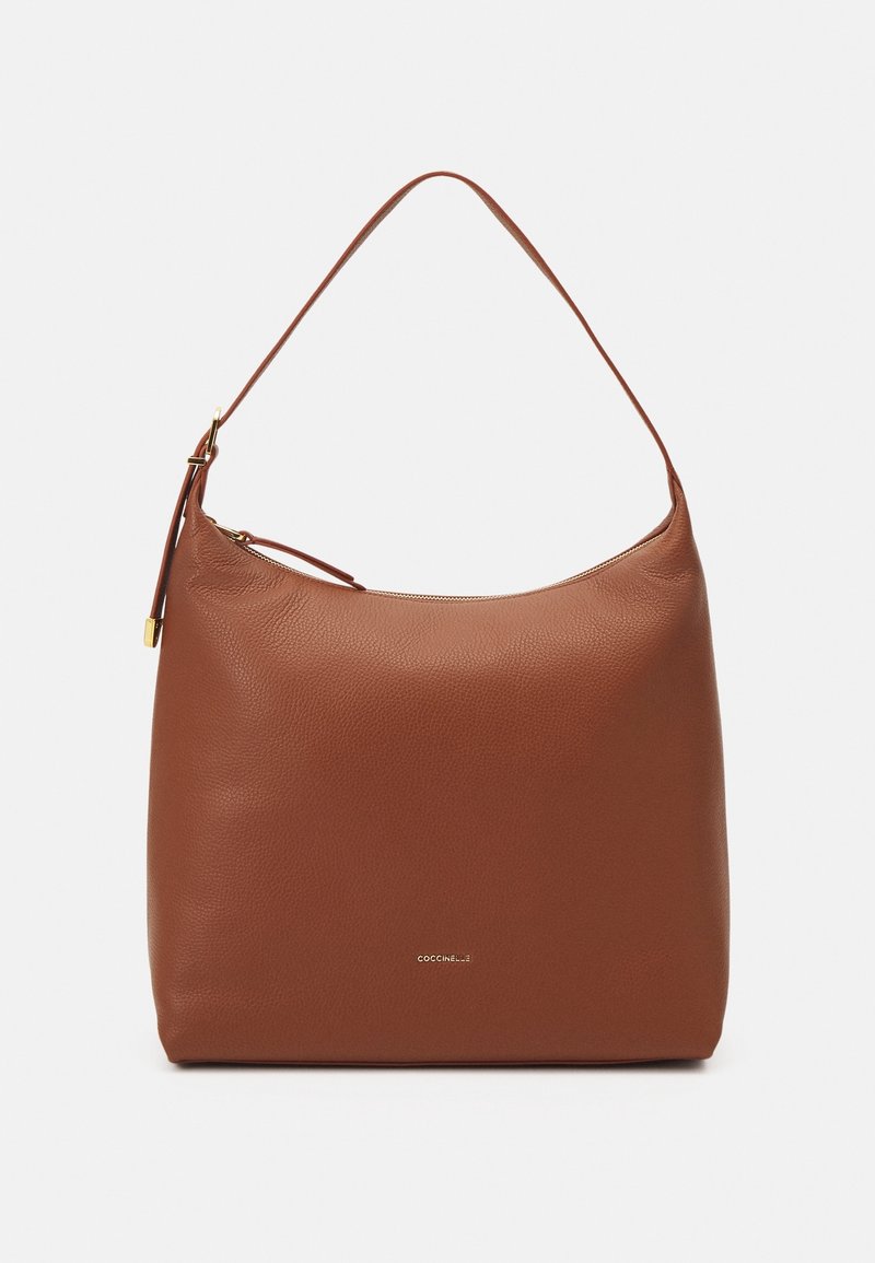 Sac bandoulière en cuir marron avec une seule sangle et une fermeture éclair dorée, présentant un petit logo de marque embossé au centre avant.