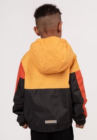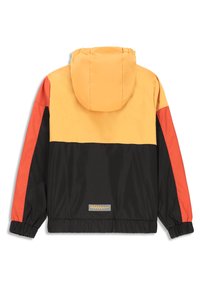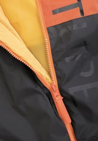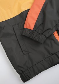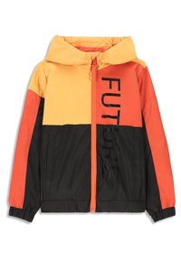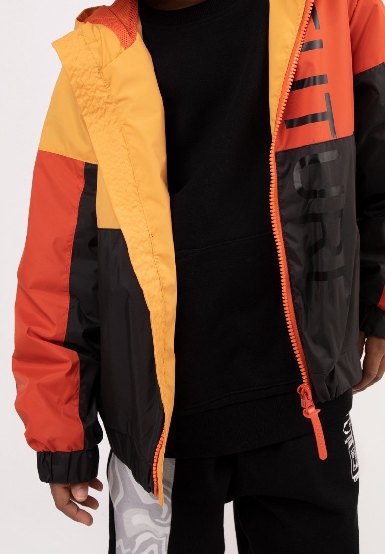 Veste color-block avec des panneaux jaune, orange, rouge et noir. Fabriquée en matériau léger, elle est équipée d'une fermeture éclair avec un tirette orange.