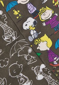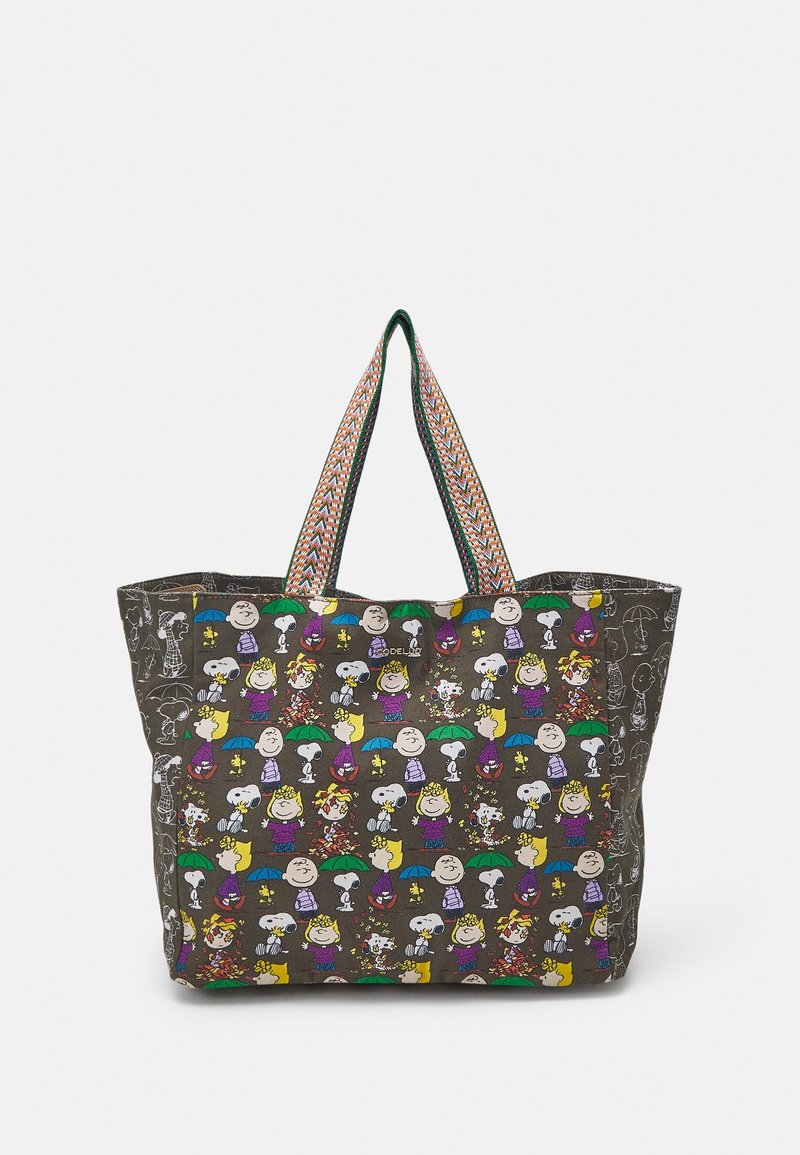 Sac fourre-tout avec motif multicolore des personnages des Peanuts, comprenant Snoopy, Lucy, Charlie Brown et Woodstock, avec des anses en tissu à motifs.