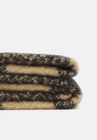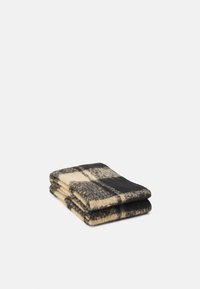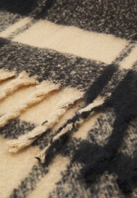 Écharpe en laine douce avec motif à grands carreaux noirs et beiges et extrémités à franges, pliée sur fond blanc.