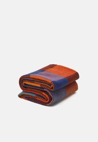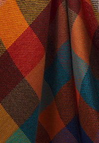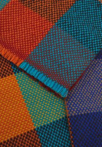 Écharpe tissée pliée avec un grand motif à carreaux en bleu, rouge, orange, jaune et beige, avec une courte frange sur les bords.