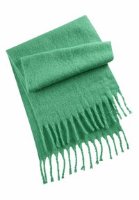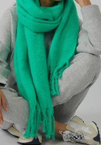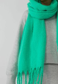 Personne portant une écharpe en laine turquoise vif à franges sur un sweat-shirt gris clair à manches longues, partiellement visible sur un fond uni.