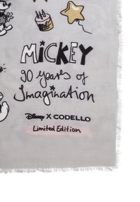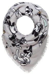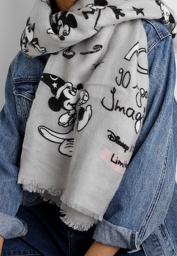 Écharpe grise avec des motifs Mickey Mouse Disney en noir et blanc et du texte, portée sur une veste en jean bleue par une personne assise.