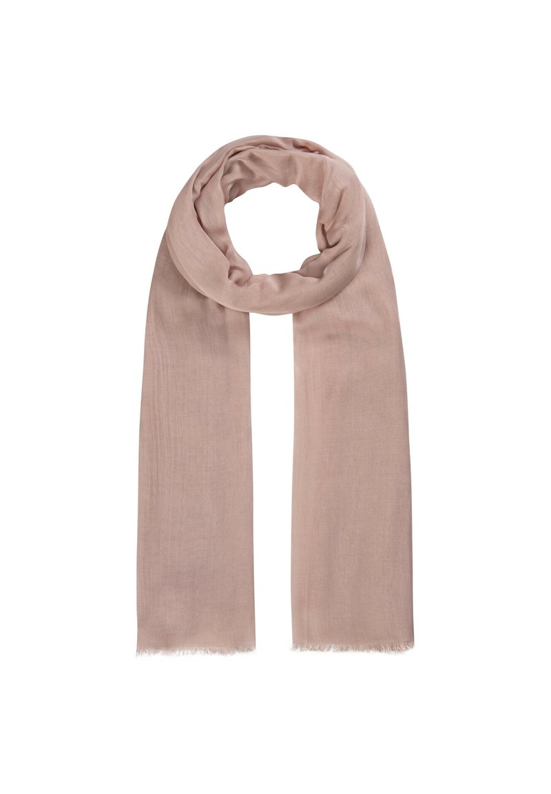 Écharpe rectangulaire rose pâle en tissu doux avec des bords légèrement effilochés, bouclée librement en haut sur un fond blanc.