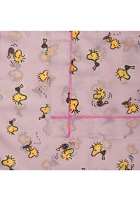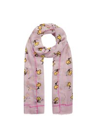 Écharpe rose clair avec motifs répétés de petits oiseaux jaunes dessinés en style cartoon et coutures rose vif le long des bords, présentée en boucle lâche.