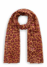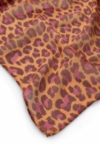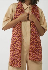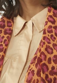 Femme portant une combinaison beige à manches courtes boutonnée avec une longue écharpe imprimé léopard orange et rose drapée autour du cou.