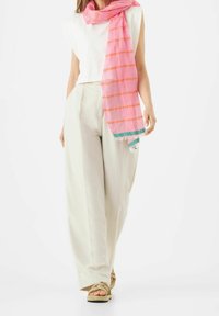 Femme portant un haut blanc sans manches et un pantalon beige, avec une écharpe rose à rayures orange et bords verts à franges.