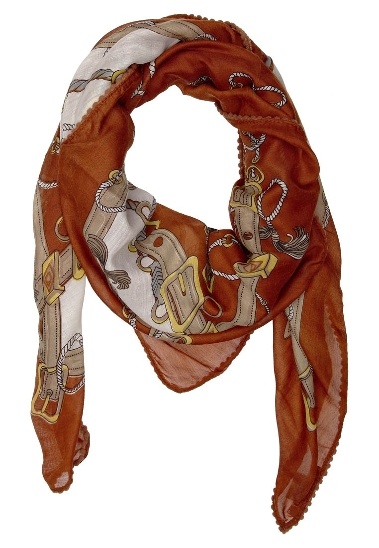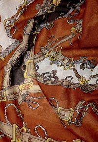 Écharpe en soie avec un fond orange rouille et blanc, présentant des motifs de ceinture et de corde dans des tons beige, or et marron.