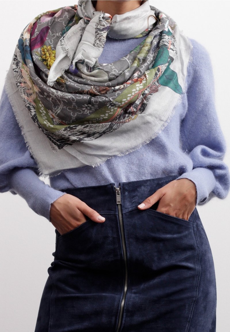 Personne portant un pull duveteux violet clair, une écharpe multicolore à motifs et une jupe en daim bleu foncé avec une fermeture éclair à l'avant, les mains dans les poches.