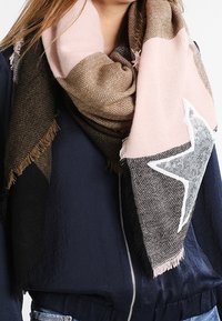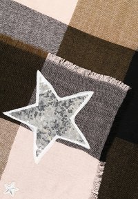 Femme portant une grande écharpe bicolore marron et rose avec une étoile argentée à paillettes, portée sur une veste bleu marine foncé à fermeture éclair avant.